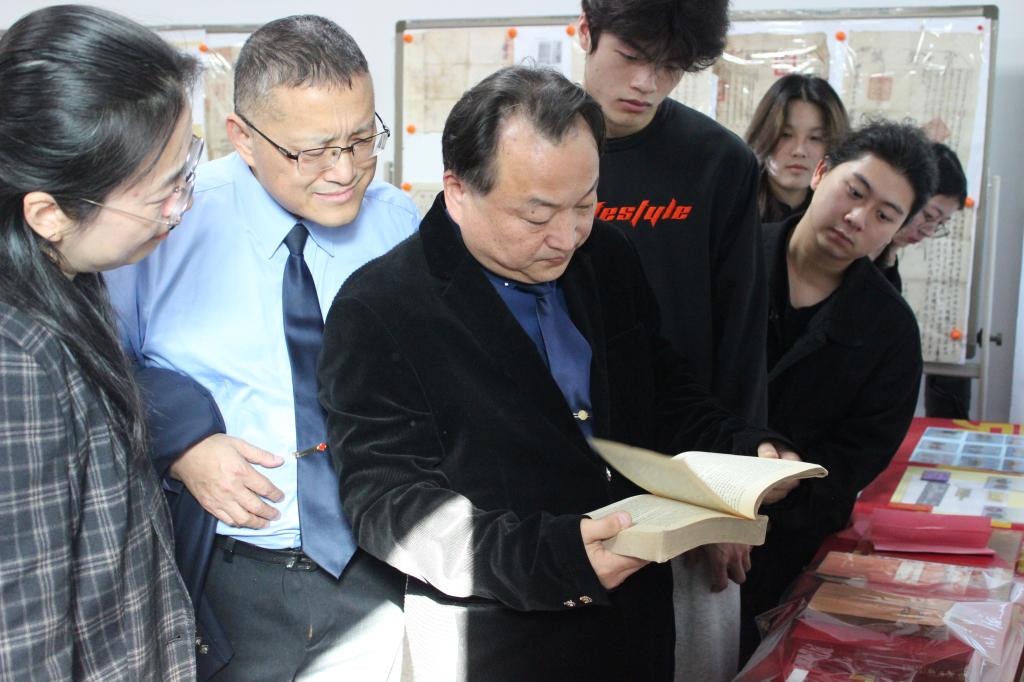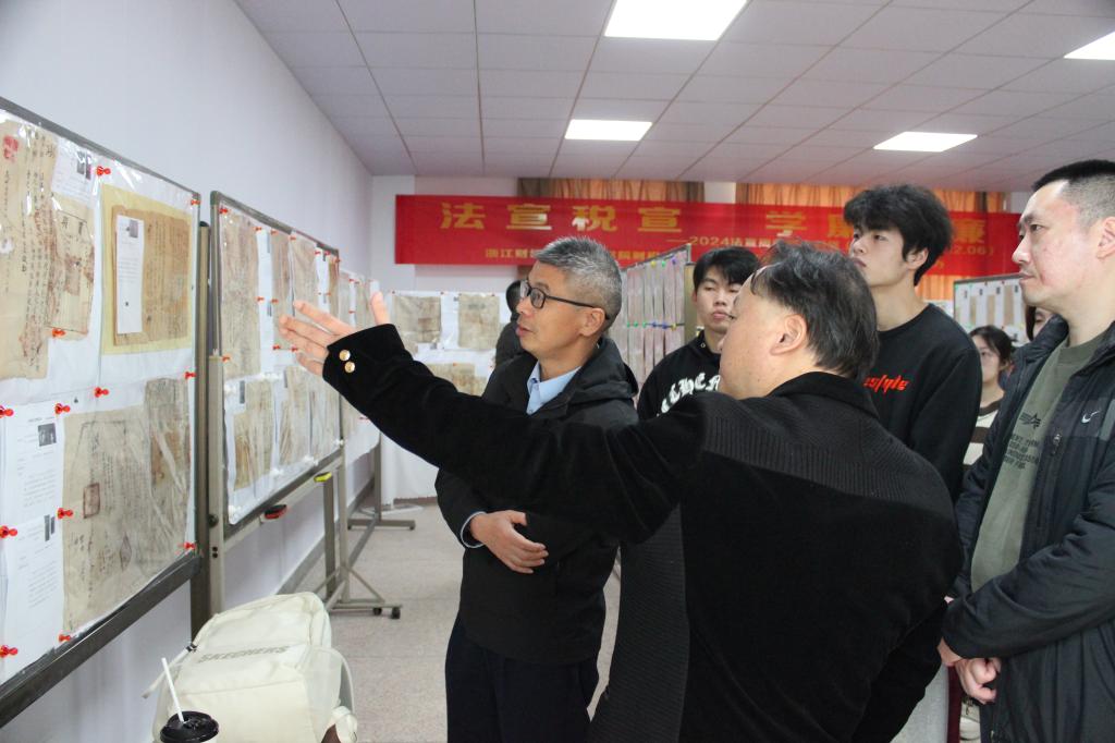 接下来联办方国家税务局总局嘉兴市秀洲区税务局副局长,同时也是本次税收史料展展品收藏者、浙江嘉兴秀洲“建根脉”陈列室负责人陈建根发表讲话。他对本次史料展的前期筹备工作进行了介绍,并对本次法宣周史料展的文物“密码”进行引读,希望通过展出税收史料能够为公司师生专业学习提供历史思考。随后的捐赠环节,陈局长将自己收藏20余年的两本印花税相关书籍、一张清朝光绪年间的税收票证史料赠与公司,王影书记接受捐赠物品并表达了感谢。