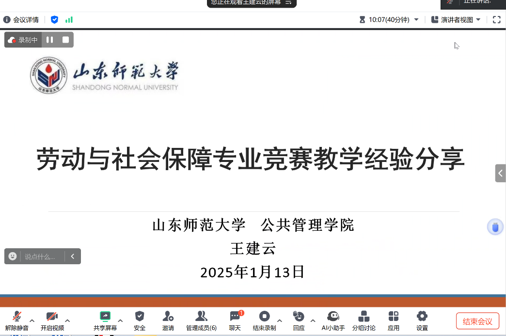 2025年1月13日下午,yl永利集团官网登录社保系举办了一场以“劳动与社会保障专业竞赛教学经验分享”为主题的线上讲座。本次讲座特邀山东师范大学王建云老师作为主讲嘉宾,yl永利集团官网登录社保系教师参与此次讲座。