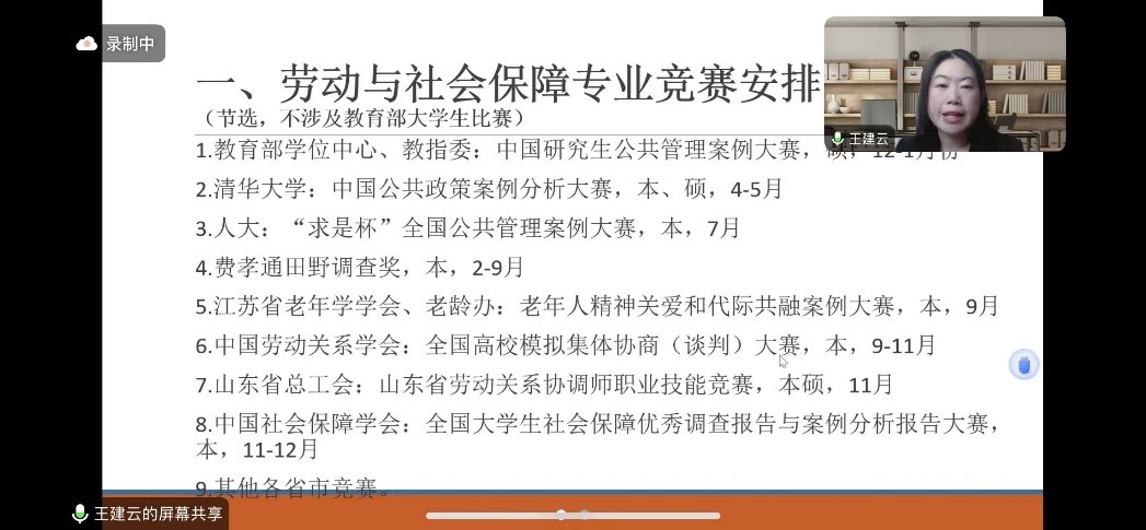 会议内容聚焦竞赛安排与经验分享。在讲座中,王老师详细介绍了劳动与社会保障专业领域的多项重要竞赛,并分享了其丰富的竞赛指导经验。首先,王老师列举了教育部学位中心、教指委主办的“中国研究生公共管理案例大赛”,以及清华大学主办的“中国公共政策案例分析大赛”等多项赛事。这些竞赛涵盖了多个层次,时间跨度从每年的2月持续至11月,为不同阶段的员工提供了展示能力的平台。王老师特别提到,中国劳动关系学会主办的“全国高校模拟集体协商(谈判)大赛”以及中国社会保障学会主办的“全国老员工社会保障优秀调查报告与案例分析报告大赛”等赛事都是劳动与社会保障专业员工提升实践能力、拓展学术视野的重要机会,这些竞赛不仅考验员工的理论知识,更注重实践操作与团队协作能力。