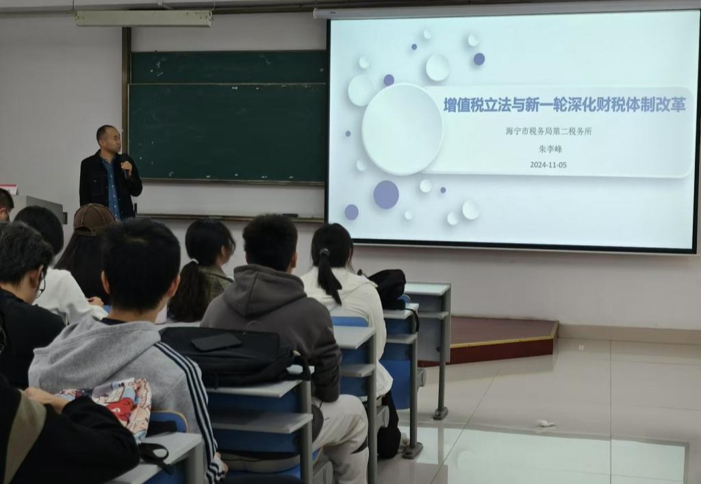 为了加深同学们对《中国税制》课程的理解与掌握,进一步了解增值税立法的相关内容,2024年11月5日下午,公司邀请了国家税务总局海宁市税务局第二税务所副所长朱李峰,在6J205开展主题为“增值税立法与新一轮深化财税体制改革”的专业讲座。本次讲座由朱计老师主持,23级税收专业共计120余位同学参加学习。