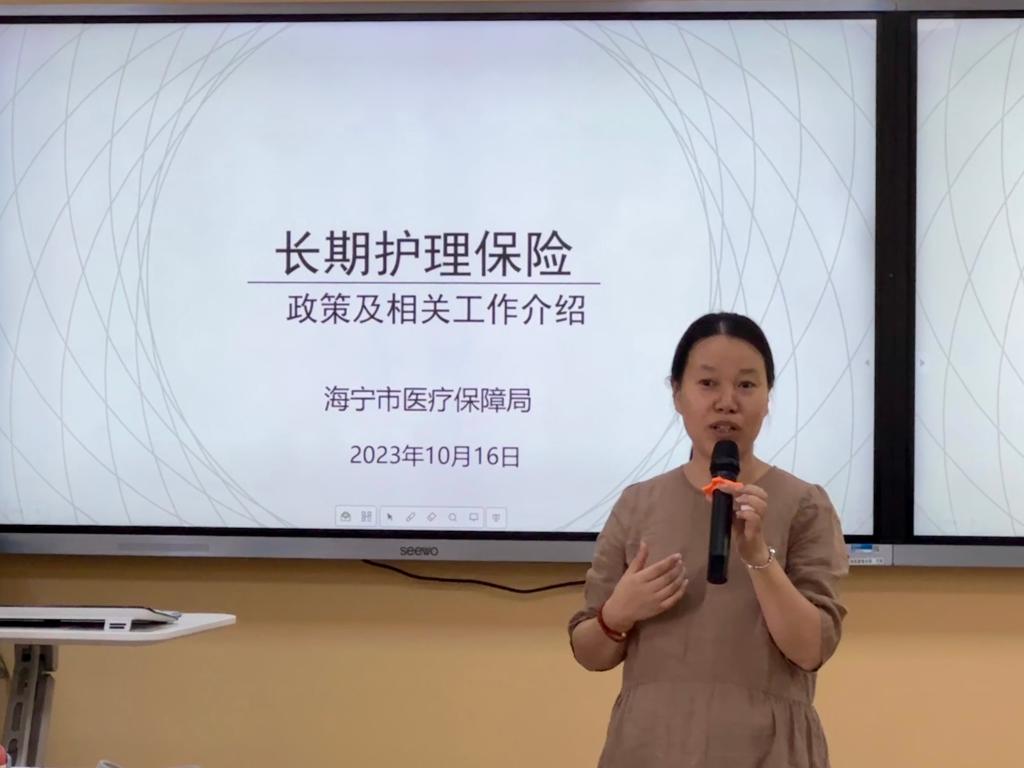 讲座以嘉兴市长期护理保险制度构建起因作为切入点展开讲解,长期护理保险制度是一项以人民为中心的社保体系和嘉兴民生实事工程,以此来应对人口老龄化的社会现状,同时促进本地的经济发展,截止到目前,海宁市参保人数达近80万。
