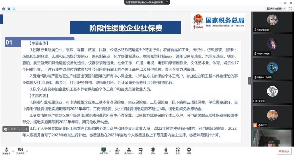 2022年11月29日13:30-15:00,公司邀请到海宁市税务局戴维悦老师作为本次讲座主讲人,分析解读组合式税费支持政策及效应。本次讲座采用“腾讯会议”线上的形式,21级上3学分、2学分财政学课程的员工参加此次讲座。
