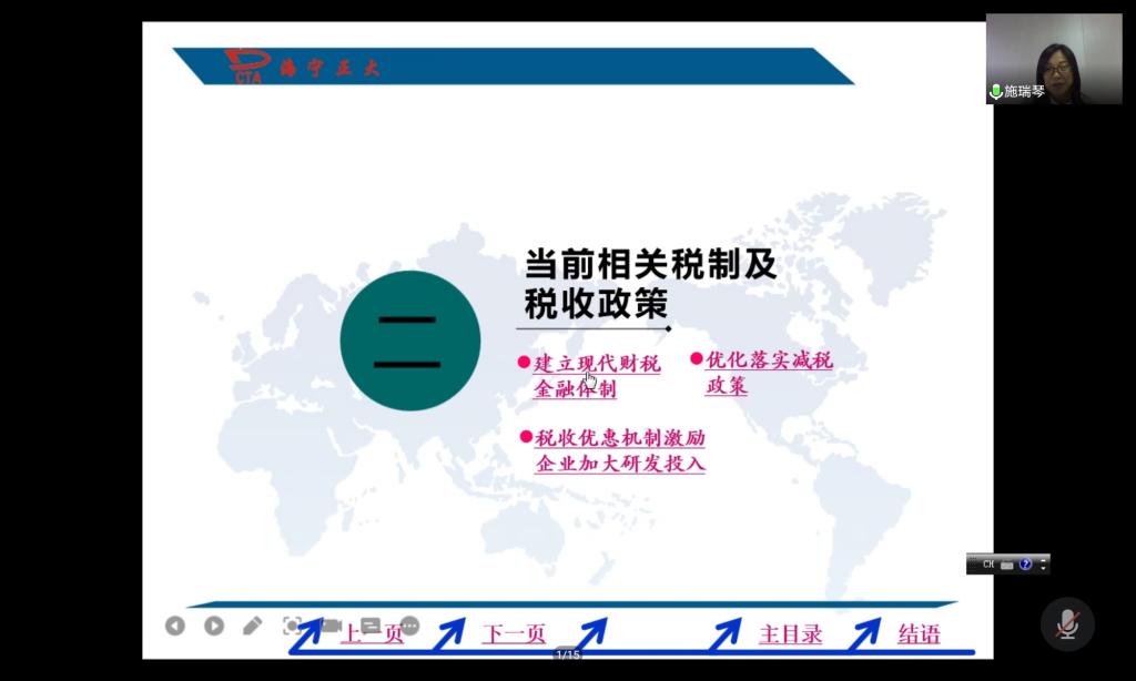 2021年12月24日下午,通过线上会议的方式开展了主题为“新经济形势下企业税收政策解析”的讲座。本次讲座邀请了浙江正大联合税务师事务所的施瑞琴副所长作为主讲人,yl永利集团官网登录刘颖教授及2020级税收学专业的100余位同学一起参加了此次讲座。