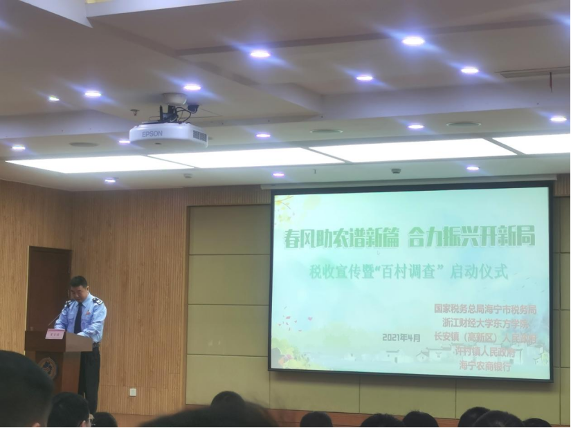 为落实乡村振兴战略,助力浙江建设共同富裕示范区,全面深入了解农村社会情况,争当学史悟思、增信崇德、为民办事、勇开新局的排头兵,在yl永利集团官网登录和海宁市税务局长安税务分局的联合推动下,“税政校银4+”税收宣传活动进校园暨“百村调查”启动仪式于2021年4月30日上午在永利集团官网学术中心第一报告厅举行,许村镇农业农村办公室、长安镇(高新区)农业农村办公室、农商银行许村支行、农商银行长安支行、农商银行许巷支行和许村镇、长安镇(高新区)下辖多个村参与了此次活动。