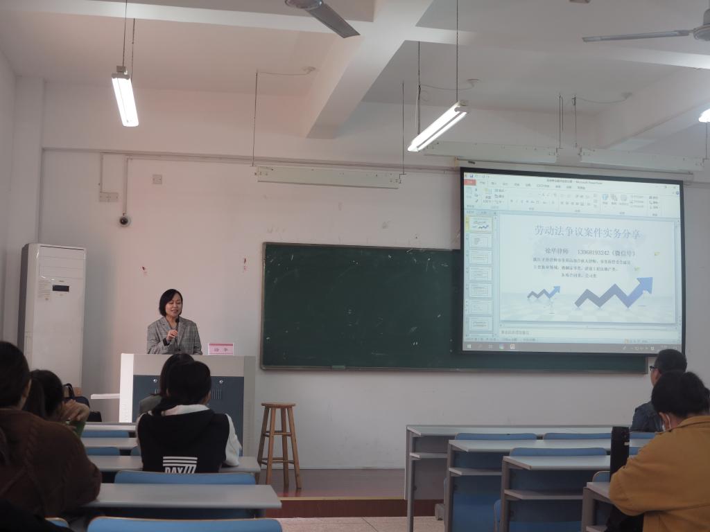 讲座尾声,徐华老师还与同学们分享了自身执业生涯的过程与相关经验。老师表示,作为一名法律工作者不仅要有全面的知识储备,更要有坚定的职业信念感。同时,员工就新业态的劳动用工和立法等问题进行了提问,两位律师也进行了认真的解答。