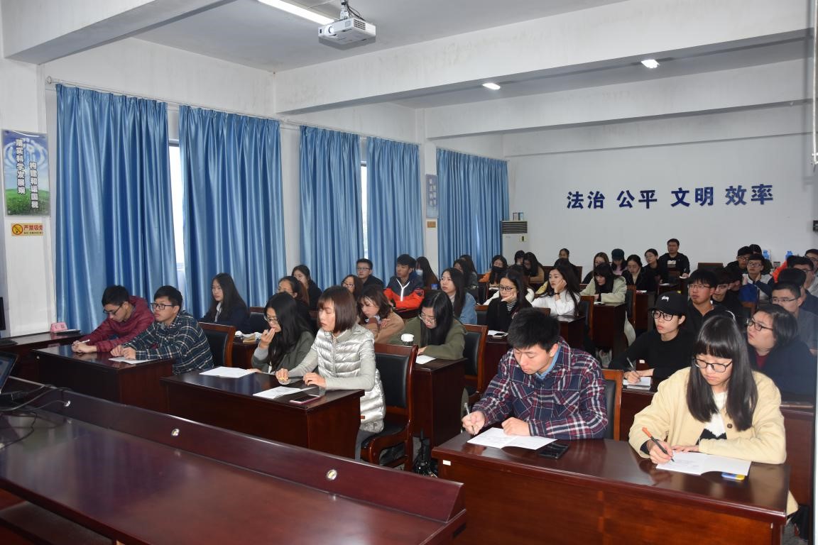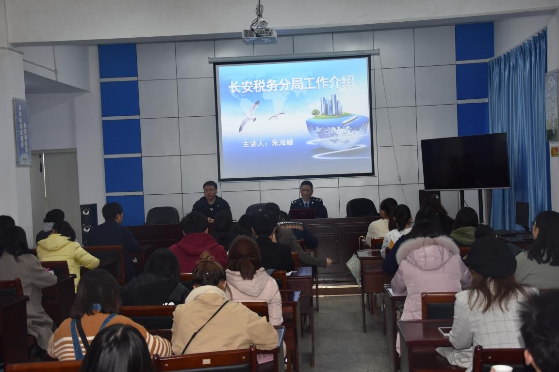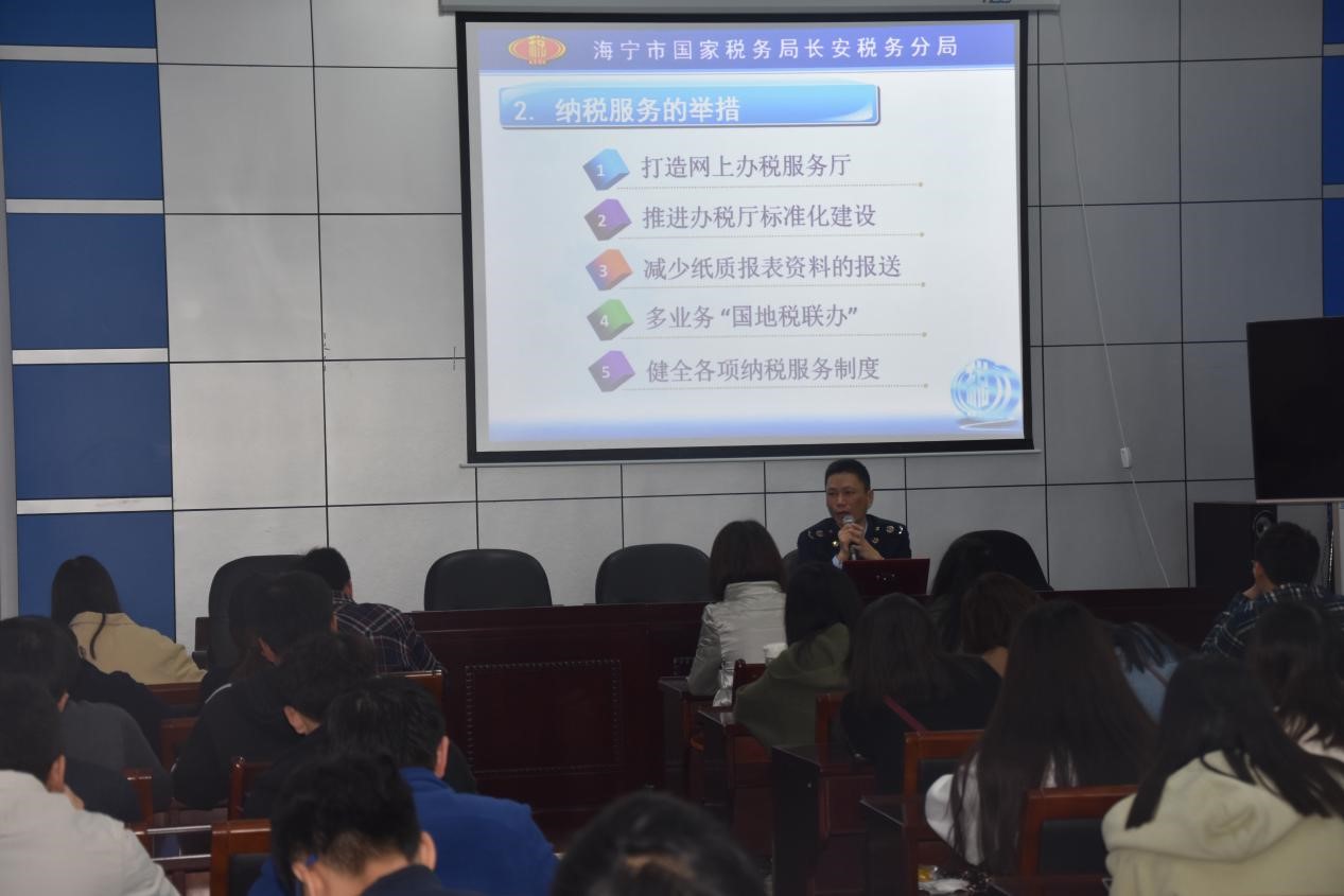 11月21日上午,公司2015级财政学专业近100名同学在《税务管理》课程任课老师的组织下,前往海宁市国家税务局长安税务分局,在四楼会议室进行该课程实践内容的学习,长安分局申报征收股朱海峰股长担任此次实践课的主讲老师。