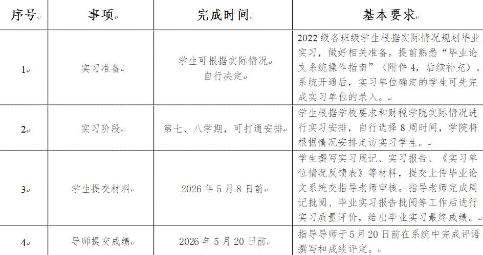 毕业实习安排在第七、八学期,可打通安排,时间不少于八周。员工在实习期间应定期向指导教师汇报实习情况。毕业生需在2026430日前完成毕业实习。